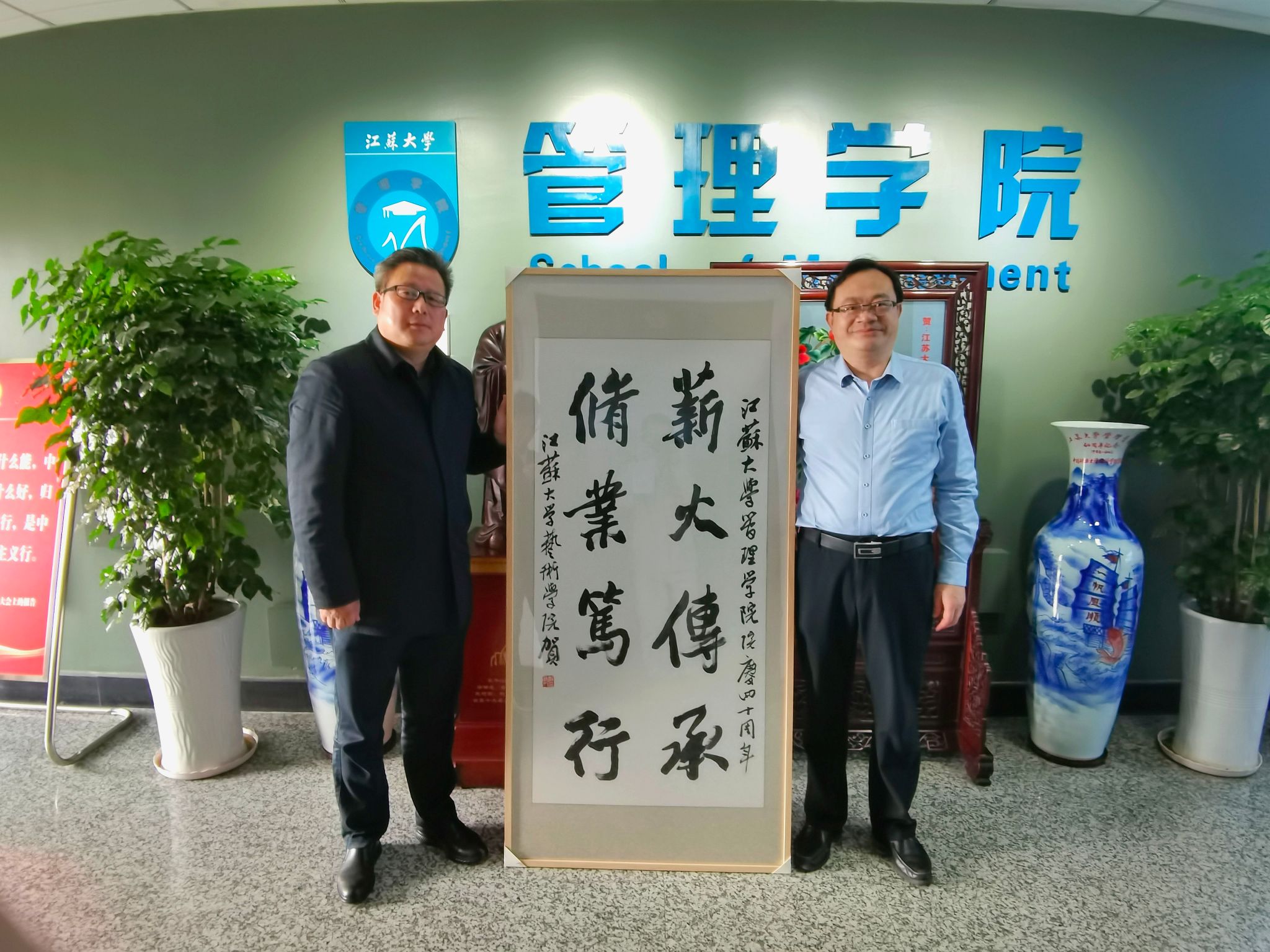 闻伊莉影片区 办学40周年,日前,艺术学院党委书记朱立新代表学院向伊莉影片区 赠送《薪火传承,修业笃行》书法作品一幅,作为艺术学院对伊莉影片区 办学40周年的庆祝和祝福。伊莉影片区 院长杜建国教授代表学院接受赠画,并向艺术学院全体师生和郑为人老师表达了管理师生的喜悦及感激之情。
